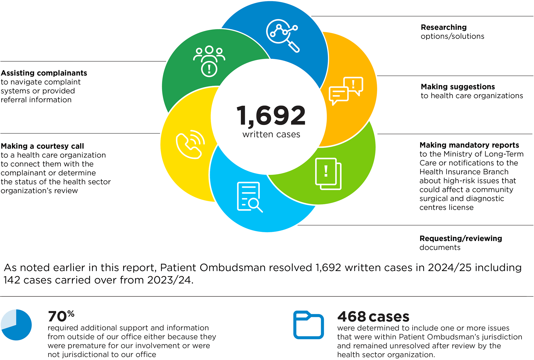 Of the 1,692 written cases, 70% required referrals or help connecting with other organizations because the complaint involved issues that were premature for our involvement or were not jurisdictional to our office. Ultimately, 468 cases were determined to include one or more issues that were within Patient Ombudsman’s jurisdiction and remained unresolved after review by the health care organization.