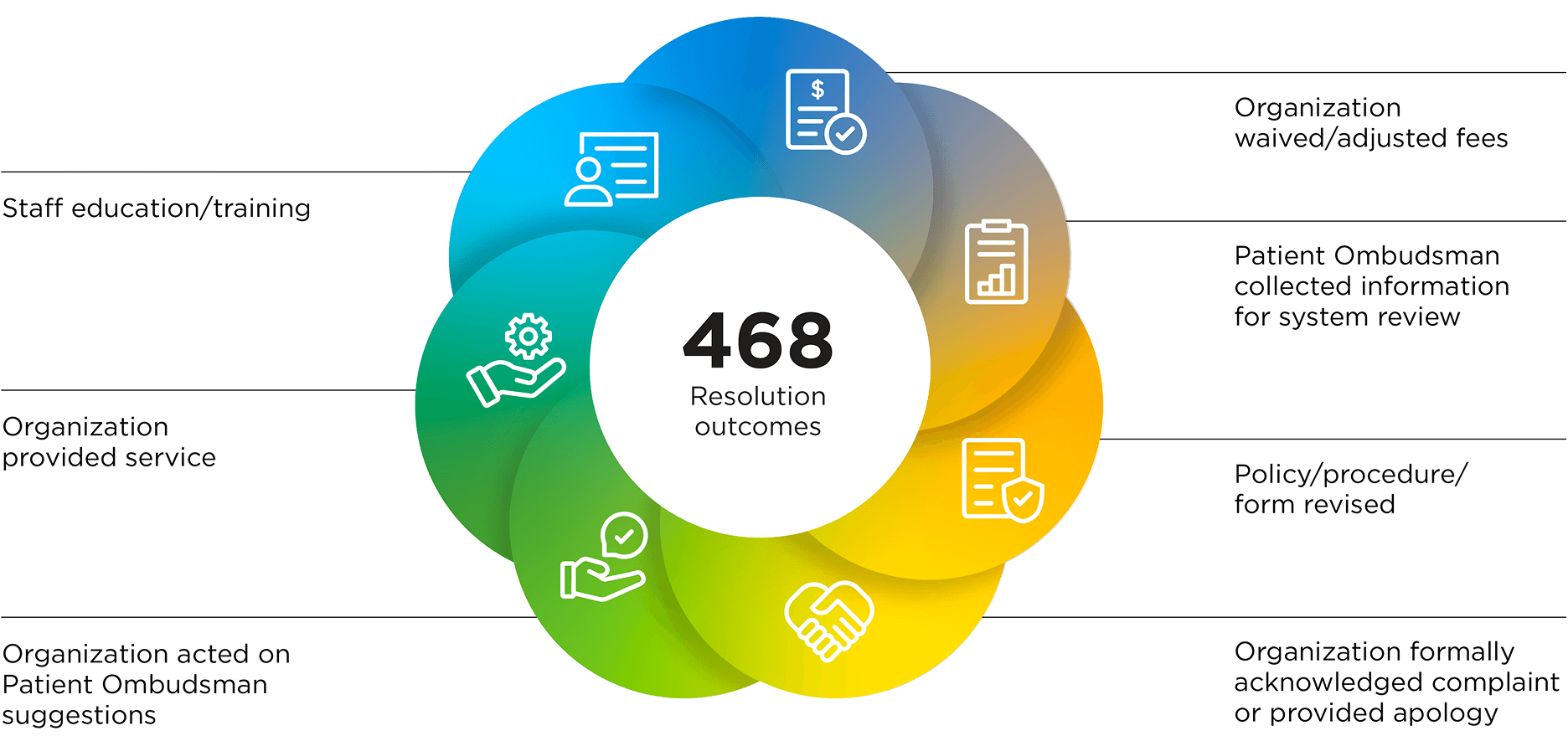 Resolution outcomes include the health care organization providing a service, acknowledging or apologizing for what happened, ensuring staff training or education, or updating policies and procedures.