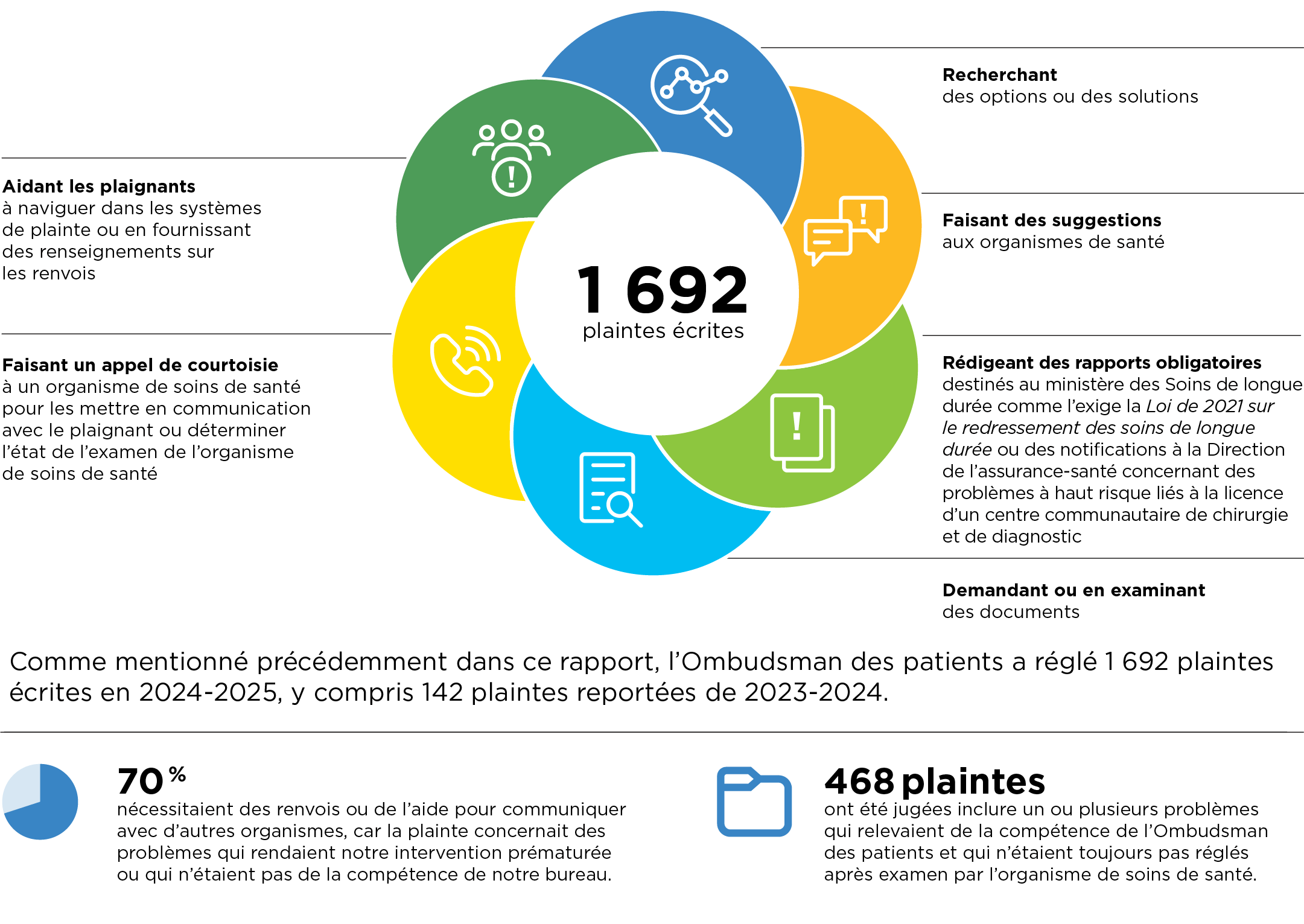 Comme mentionné précédemment dans ce rapport, l’Ombudsman des patients a réglé 1 692 plaintes écrites en 2024-2025, y compris 142 plaintes reportées de 2023-2024.
